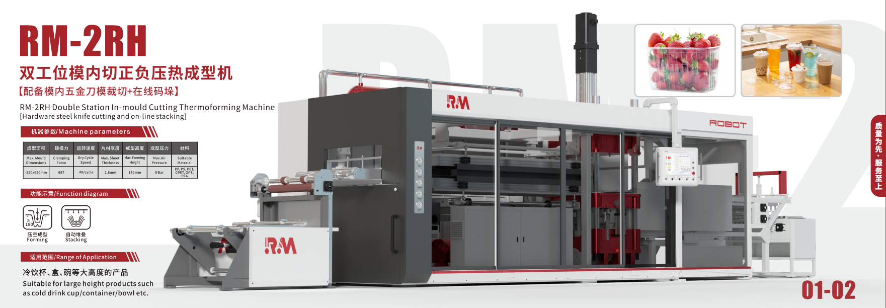雙工位模內切正負壓熱成型機 【配備模內五金刀模裁切+在線碼垛】 RM-2RH Double Station In-mould CuttingThermoforming Machine [Hardware steel knife cutting and on-line stacking]